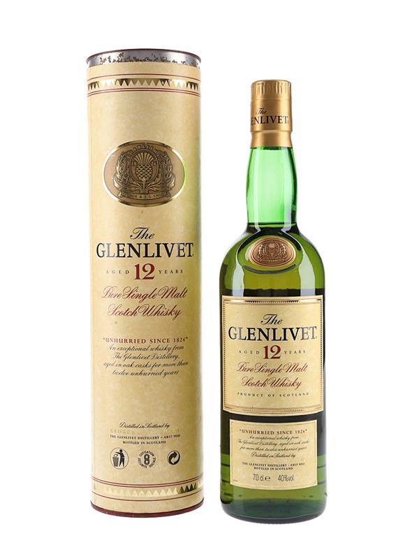A bottle of The Glenlivet 12 Year Old Pure Single Malt Scotch Whisky. We estimate this was bottled in the late 1990s to early 2000s.