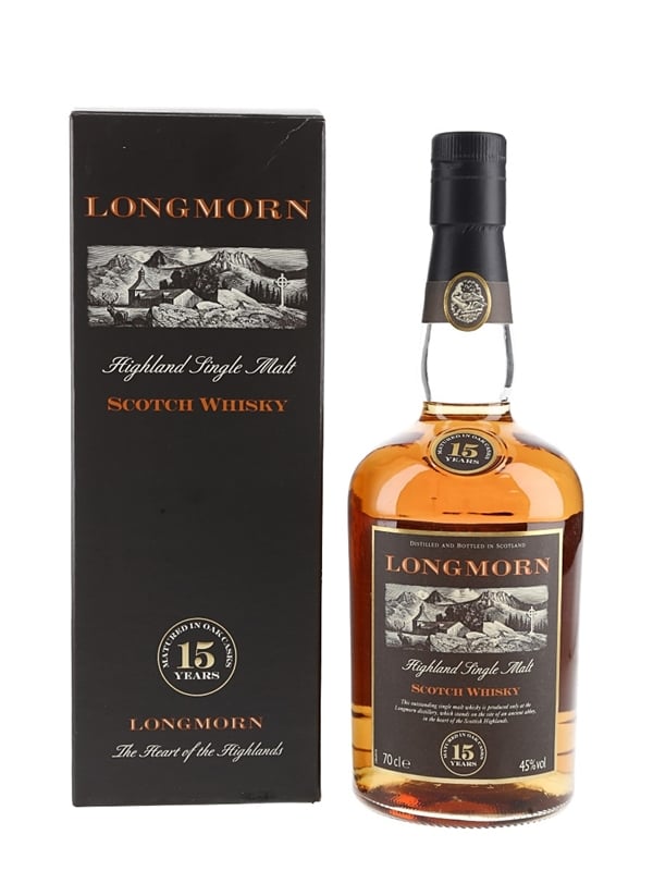 A bottle of Longmorn 15 Year Old Highland Single Malt Scotch Whisky. .