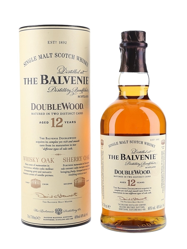 A bottle of The Balvenie 12 Year Old Doublewood Single Malt Scotch Whisky. This was matured first in traditional whisky oak casks, followed by a period of ageing in sherry casks.