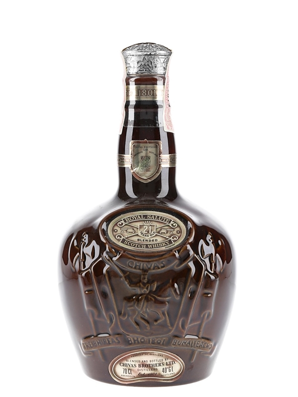 A bottle of Royal Salute 21 Year Old, presented in a brown Spode decanter with the original velvet bag. We estimate this was bottled in the 1990s.