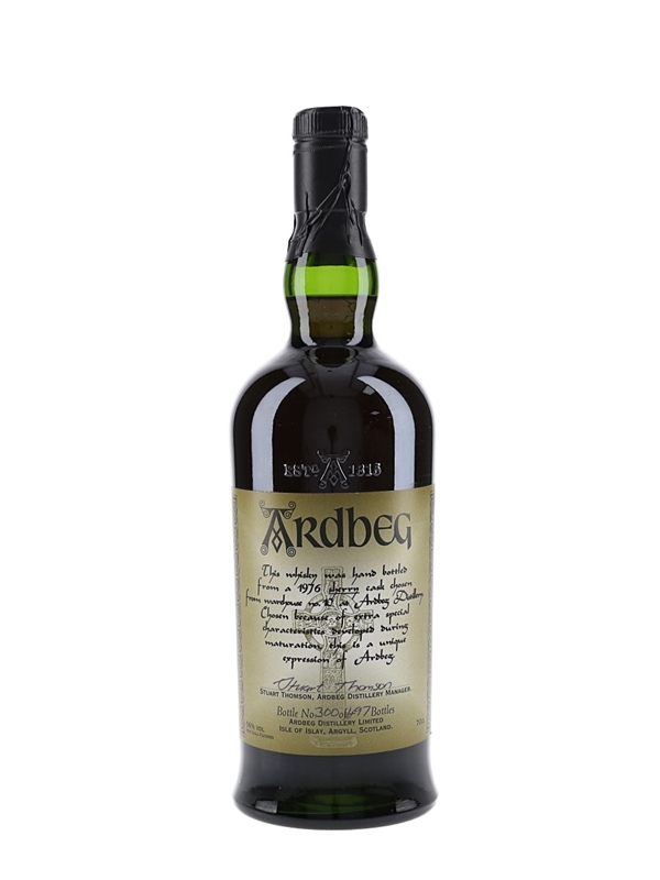 A bottle of Ardbeg Single Cask Single Malt Scotch Whisky. This was distilled on 24 November 1976, matured in a Sherry butt and bottled at a cask strength of 56% on 23 June 1999.