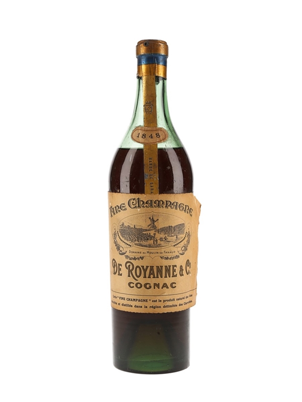 A bottle of De Royanne & Co. 1848 Fine Champagne Cognac. We estimate this was bottled in the 1930s.