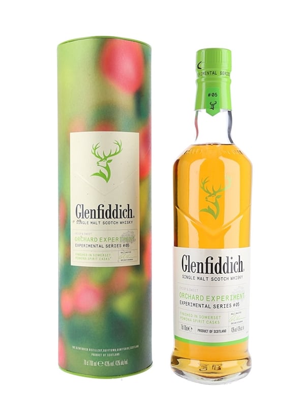 A bottle of Glenfiddich Orchard Experiment Single Malt Scotch Whisky, finished in Somerset Pomona spirit casks. This is the fifth release in the distillery's Experimental series.