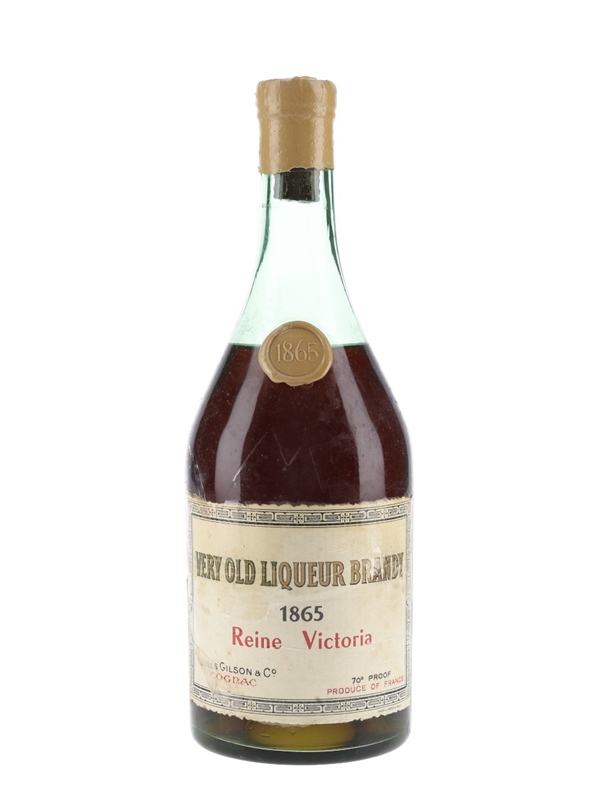 A bottle of Jules Gilson & Co. 1865 Very Old Liqueur Brandy Cognac. We estimate this was bottled in the 1960s.