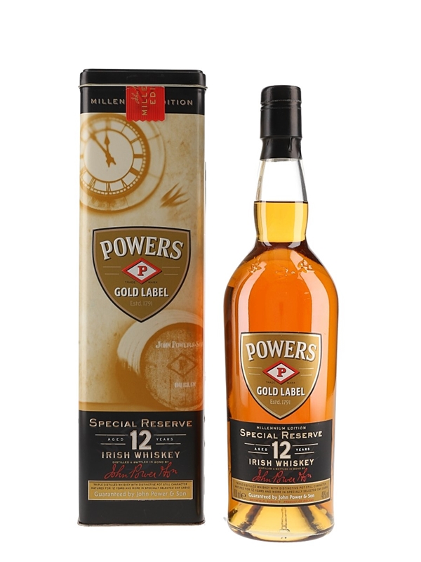 A bottle of Powers 12 Year Old Gold Label Irish whiskey, distilled and bottled in bond by John Power & Son.