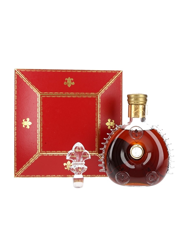A bottle of Rémy Martin Louis XIII Grande Champagne Cognac. This is composed of Grande Champagne eaux-de-vie aged between 40 and 100 years and is presented in a Baccarat Crystal decanter.