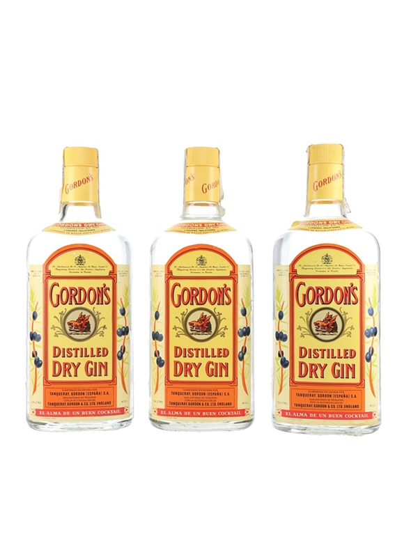 This lot contains three bottles of Gordon's Dry Gin distilled and bottled in Spain by Tanqueray, Gordon & Co. Ltd. We estimate these were bottled in the 1980s.