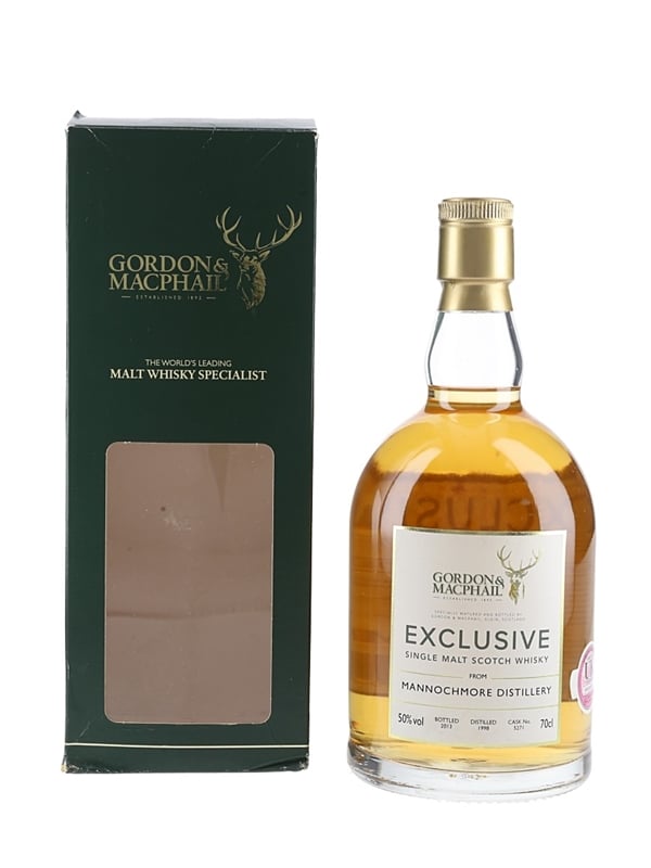 A bottle Mannochmore 1998 14 Year Old Single Malt Scotch Whisky. This was distilled on the 2nd of September 1998 and bottled on the 18th of July 2013 at 50% ABV as part of the Exclusive Series for Independent Bottler Gordon & MacPhail.