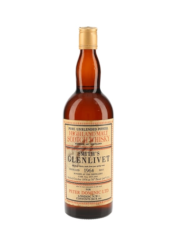 A bottle of Smith's Glenlivet Pure Unblended Pot Still Highland Single Malt Scotch Whisky. This was distilled in April 1964, bonded at the distillery and matured for 12 years in oak wood before being bottled for Peter Dominic Ltd., in October 1976 at 40% ABV.