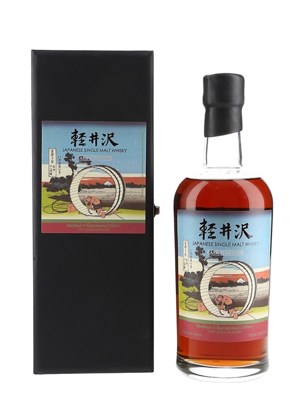 A bottle of Karuizawa from the 36 Views of Mount Fuji series. Each bottle in this series was produced from Karuizawa's final two vintages, 1999 and 2000, and are bottled at cask strength. The labels feature artwork by Japanese ukiyo-e artist Hokusai, depicting Mount Fuji from different aspects.