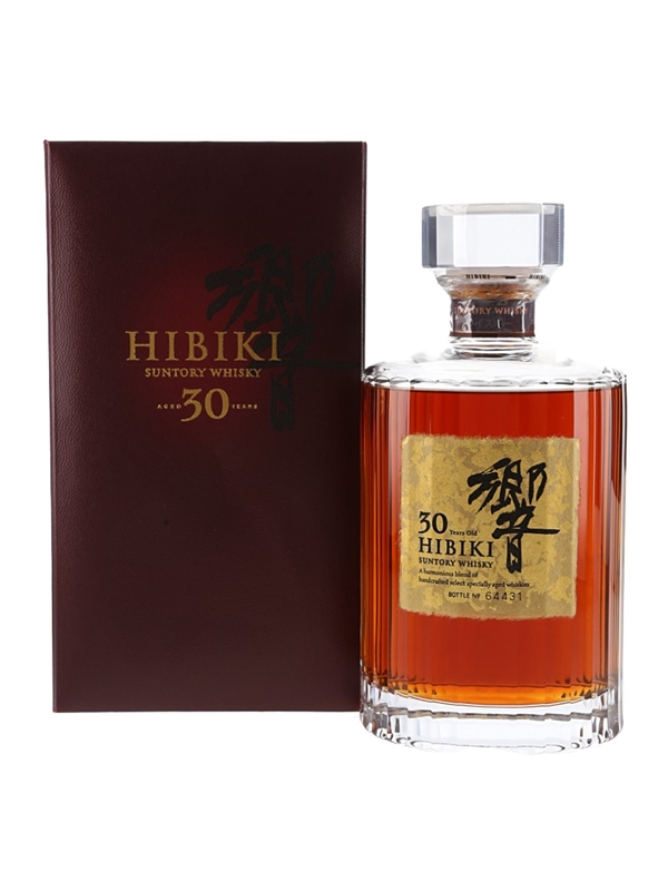 A bottle of Hibiki 30 Year Old Suntory Whisky produced in Japan. This is a critically acclaimed blend from Suntory and is presented in a Kagami crystal decanter. It is presented in a 30-faceted crystal celebrating the beauty and elegance that is Hibiki.