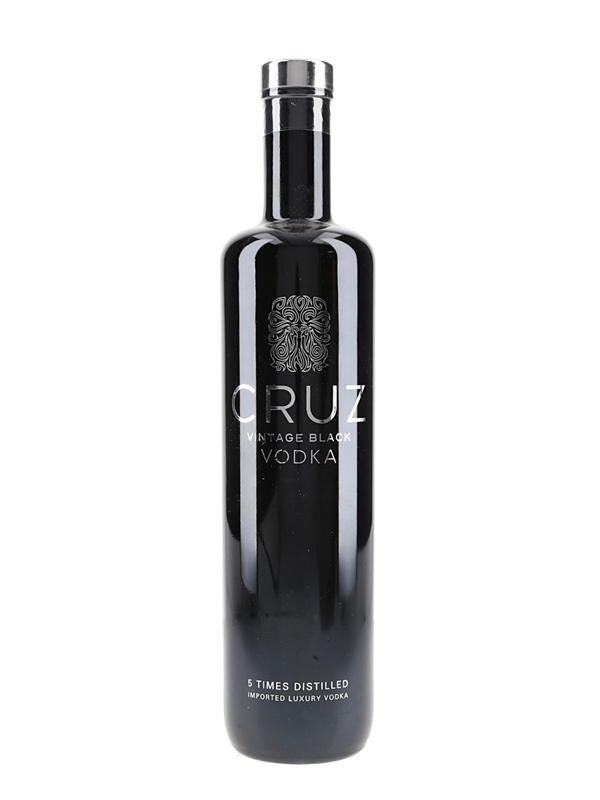 A bottle of Cruz Vintage Black Vodka. This is 5 times distilled in the USA and bottled in South Africa.