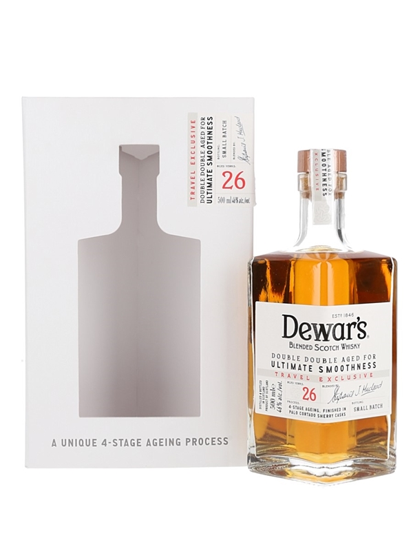 A 50cl bottle of Dewar's 26 Year Old Blended Scotch Whisky, finished in Palo Cortado sherry casks and bottled as part of Double Double series. This bottle is a Travel exclusive bottling.