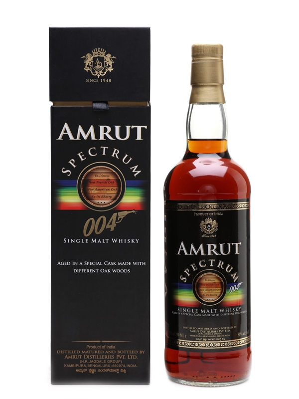 A bottle of Amrut Spectrum Indian single malt whisky. The packaging includes a '004' logo representing the four cask types, and mimicking James Bond's famous '007'. This 2017 release is the first time that Spectrum has been available in the US.