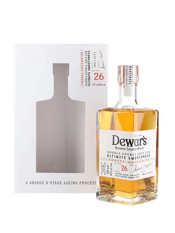 A 50cl bottle of Dewar's 26 Year Old Blended Scotch Whisky, finished in Palo Cortado sherry casks and bottled as part of Double Double series. This bottle is a Travel exclusive bottling.