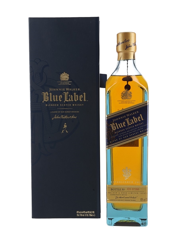 A bottle of Johnnie Walker Blue Label, a super premium blend made from long-aged malt and grain whiskies.