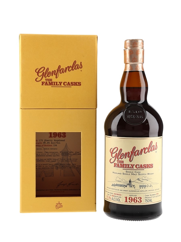 A bottle of Glenfarclas 1963 Single Malt Scotch Whisky. This was distilled in 1963, matured in a sherry hogshead and bottled at 50.8% ABV on 13th October 2011.
