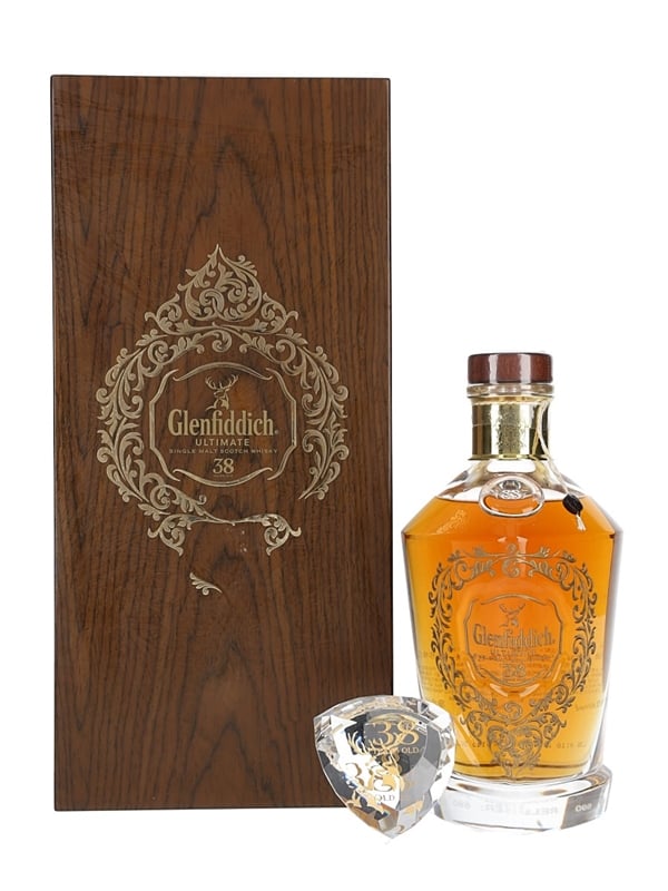 A bottle of Glenfiddich Ultimate 38 Year Old Single Malt Scotch Whisky First Release, exclusively bottled for the Chinese market. This whisky was matured in a combination of American oak barrels and European oak butts, then transferred for a further two months' maturation in Warehouse number 8. This is presented in a crystal decanter decorated with 24K gold and comes with crystal stopper in a presentation box. The bottling code indicates this was bottled in 2013.