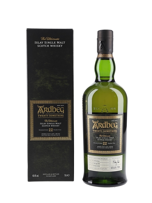 A bottle of Ardbeg Twenty Something The Ultimate Islay Single Malt Scotch Whisky, a 22 Year Old expression distilled in spring 1996, matured in ex-bourbon casks and bottled on 18 July 2018. This is the Special Committee Only Edition and was bottled at 46.4% ABV.