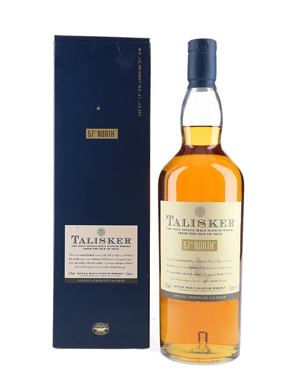 A litre bottle of Talisker 57 Degrees North Single Malt Scotch Whisky, bottled at 57% ABV.