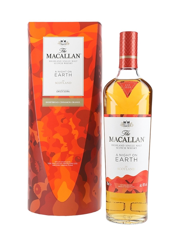 A limited edition bottle of The Macallan A Night On Earth in Scotland Highland Single Malt Scotch Whisky, celebrating the joy of New Year's Eve, known in Scotland as Hogmanay. This was aged in European and American sherry seasoned oak casks and ex-bourbon American oak casks. The packaging was designed by Japanese-French illustrator Erica Dorn.