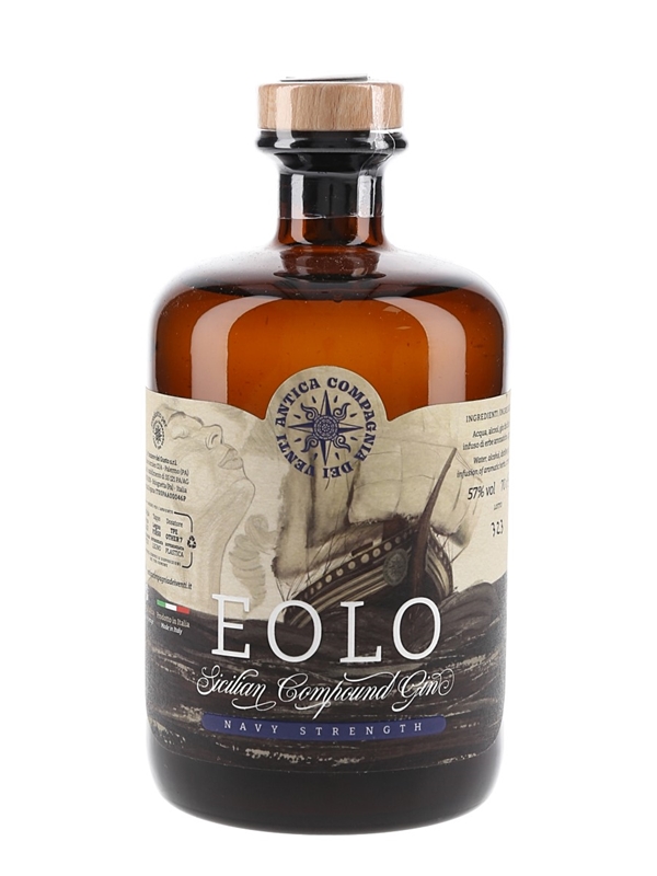 A bottle of Eolo Sicilian Compound Gin produced in Italy and bottled at 57% ABV.