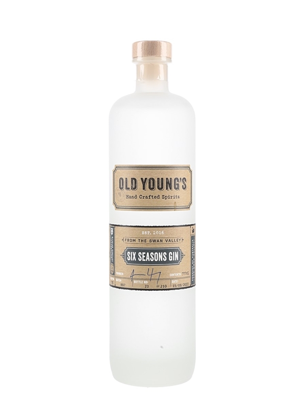 A bottle of Old Young's Six Seasons Gin from the Swan Valley, Australia. This is bottle number 23 of 210 bottles; it was bottled from batch number B97.