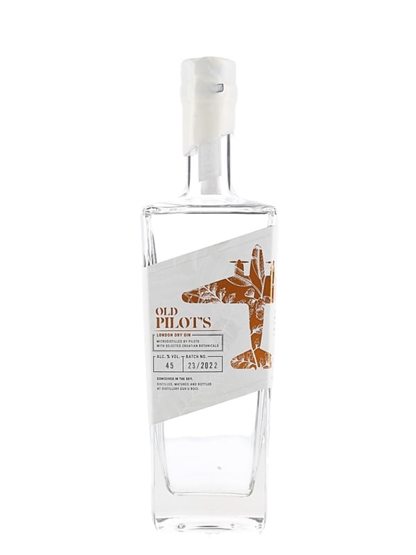 A bottle of Old Pilot's London Dry Gin produced in Croatia and bottled at 45% ABV.