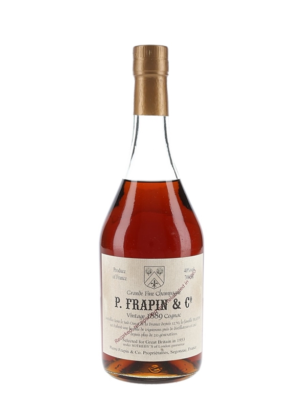 A bottle of P. Frapin & Co 1889 Tres Vieille Grande Champagne Fine Liqueur Cognac produced in France. This was produced and bottled in France by P Frapin & Co. and selected by Sotheby's. This was originally selected in 1953 before being recorked, recapsuled and relabeled in 1963.