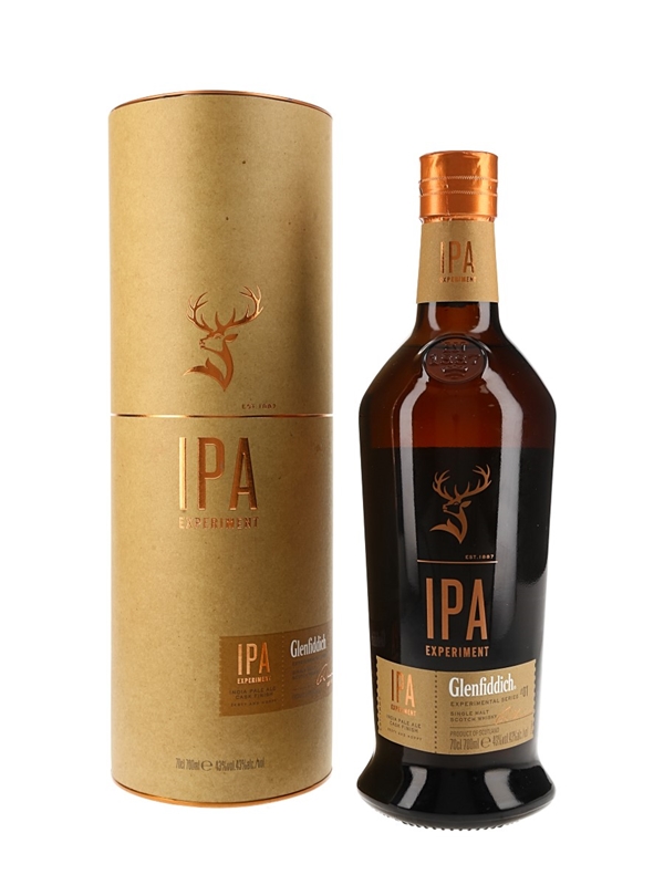A bottle of Glenfiddich IPA Single Malt Scotch Whisky, the first release in the distillery's Experimental series. This was finished in India Pale Ale craft beer casks before bottling.