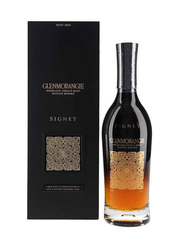 A bottle of Glenmorangie Signet Highland Single Malt Scotch Whisky. Some of the spirits in this bottling have been distilled from chocolate malt, commonly used in stouts and porters.