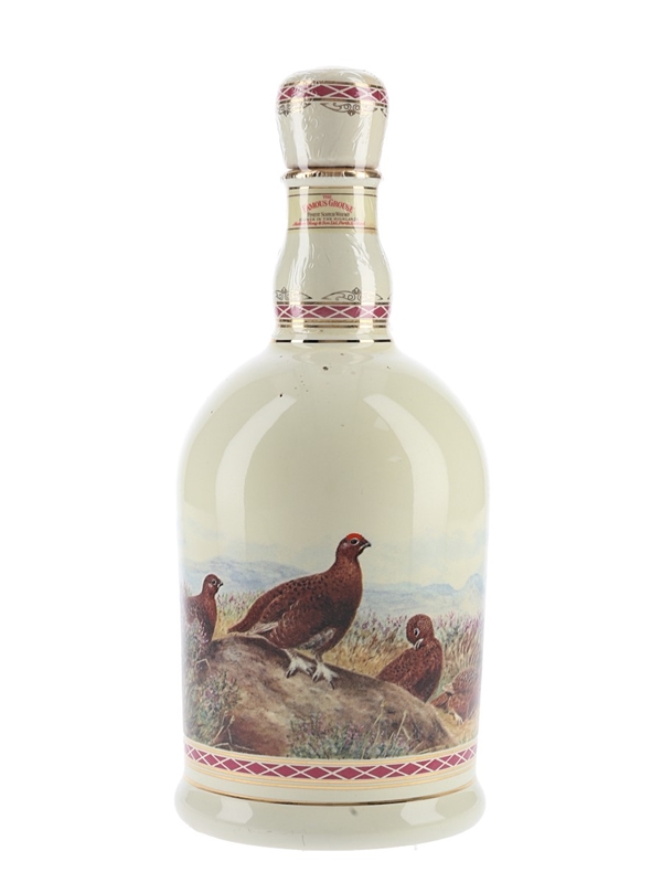 A bottle of The Famous Grouse blended whisky in a Wade porcelain decanter, gilded with 24-carat gold and depicting a 'Summer in the Highlands' by artist Stanley Todd.