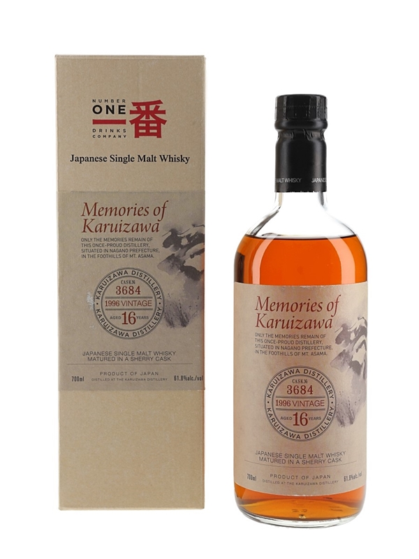 A bottle of Karuizawa 1996 16 Year Old Memories Of Karuizawa Japanese Single Malt Whisky. This was bottled from Sherry cask number 3684 by Number One Drinks Company.