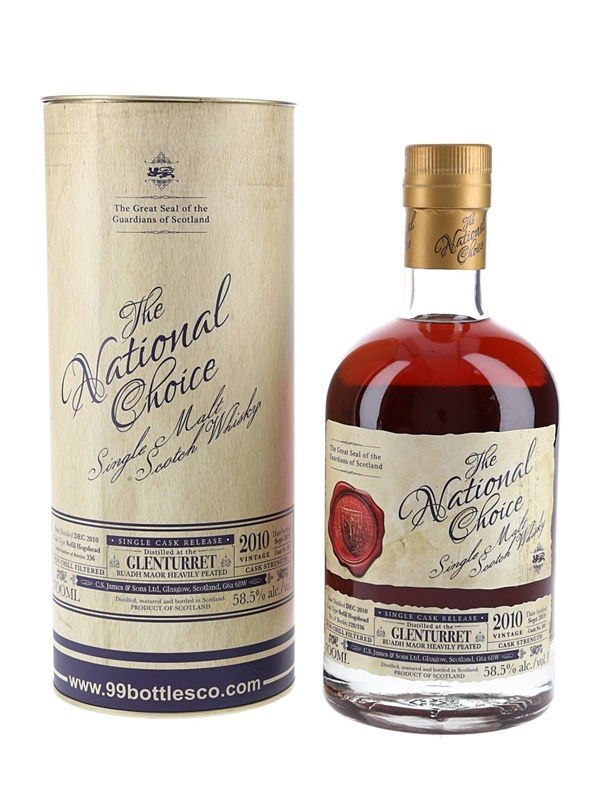 A bottle of Glenturret Ruadh Maor Single Malt Scotch Whisky. This was distilled in December 2010, matured in a refill hogshead and bottled in September 2019 by C.S. James & Sons Ltd for the National Choice series.