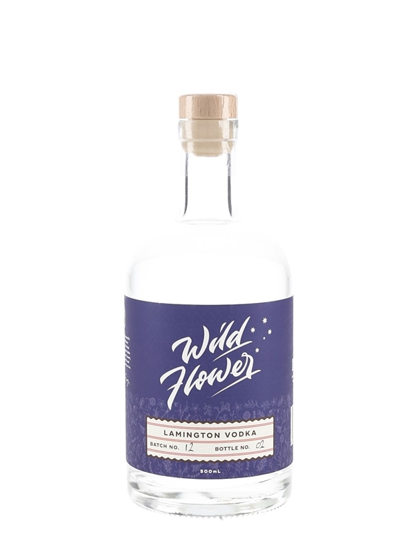 A 50cl bottle of Wild Flower Lamington Vodka produced in Australia and bottled at 40% ABV. This is bottle number 02 from batch number 12.