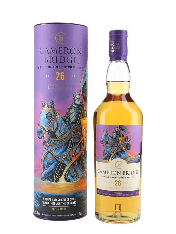 A bottle of Cameronbridge Single Grain Scotch Whisky. This was matured for 26 years in refill casks before bottling in 2022 at a natural cask strength of 56.2% ABV for Diageo's Special Releases series.