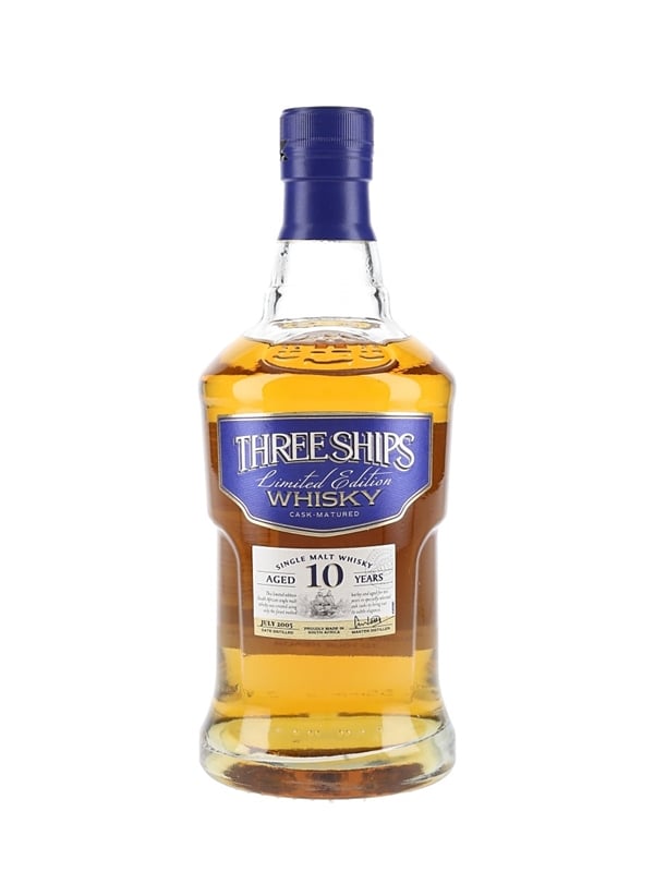 A bottle of Three Ships 10 Year Old Single Malt Whisky, distilled in July 2005 by The James Sedgwick Distillery, South Africa.