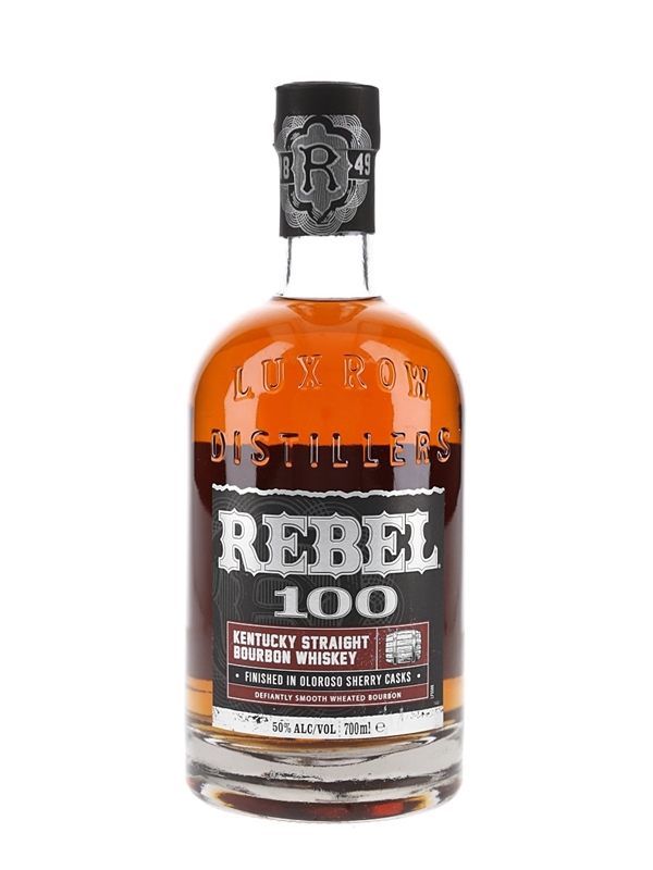 A bottle of Rebel 100 Kentucky Straight Bourbon Whiskey. This was matured in oloroso sherry casks and bottled at 50% ABV by Lux Row Distillers.