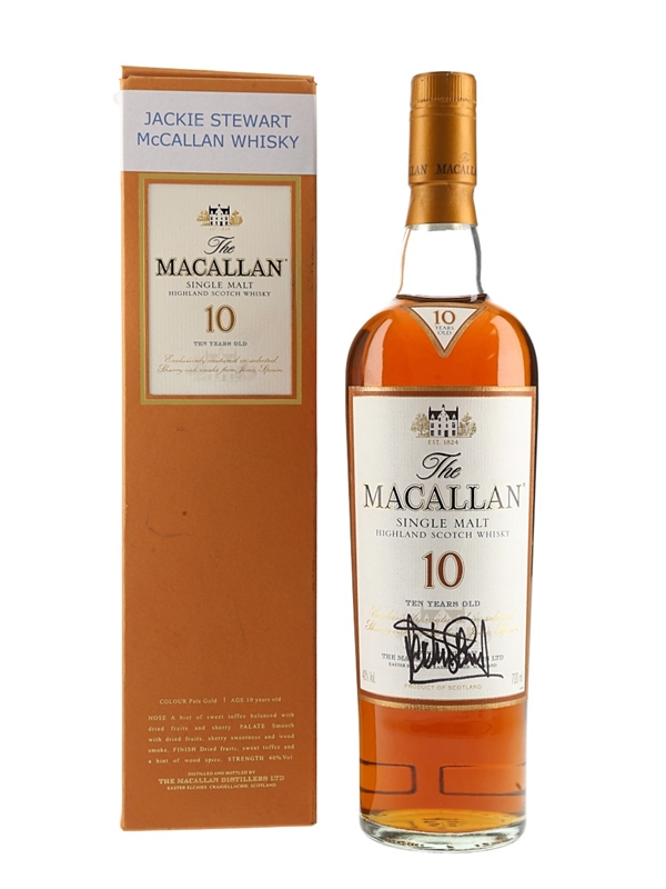 A bottle of The Macallan 10 Year Old Highland Single Malt Scotch Whisky signed by three times Formula 1 World Champion Sir Jackie Stewart. Exclusively matured in selected sherry casks from Jerez, Spain. We estimate this was bottled in the early 2000s.