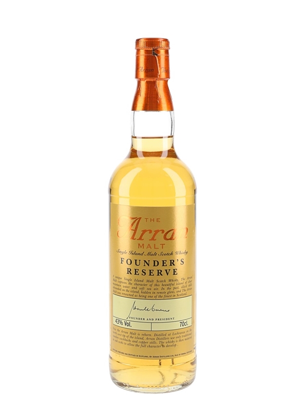 A bottle of The Arran Malt Founder's Reserve Single Island Malt Scotch Whisky, bottled exclusively for shareholders of the Arran distillery.