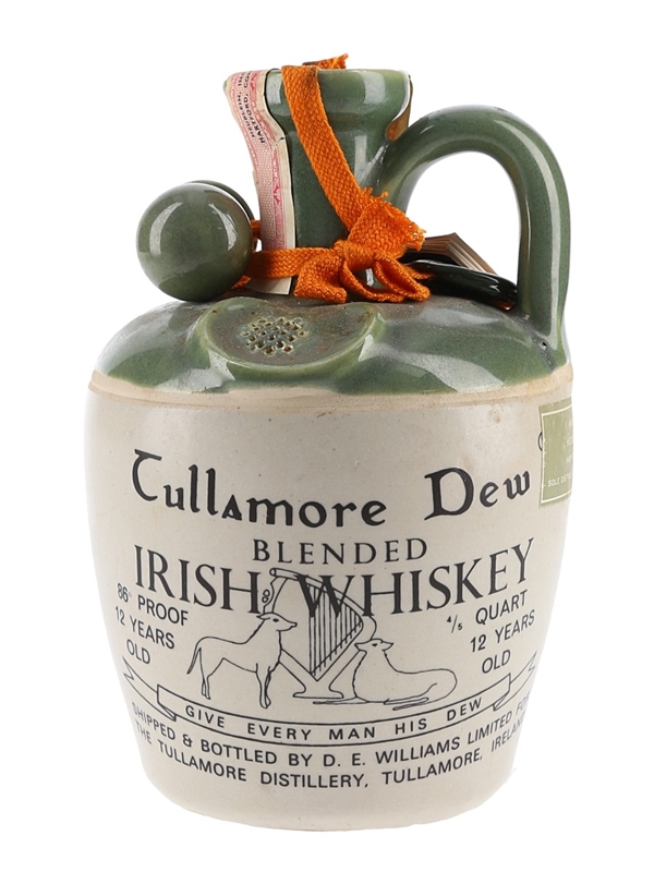 A bottle of Tullamore Dew 12 Year Old Irish Whiskey presented in a ceramic decanter. We estimate this was bottled in the 1970s. This was Imported to the US by D.E. Williams.