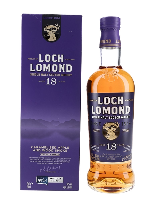 A bottle of Loch Lomond 18 Year Old Single Malt Scotch Whisky.