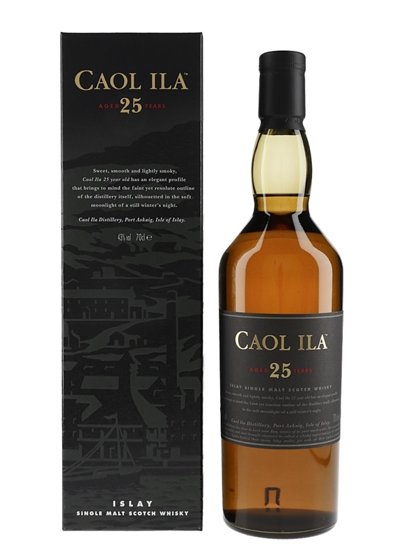 A bottle of Caol Ila 25 Year Old Islay Single Malt Scotch Whisky. Introduced in 2010, after cask strength versions in 2004 and 2005, this is the first officially-bottled Caol Ila 25 Year Old to be bottled at 43% ABV.