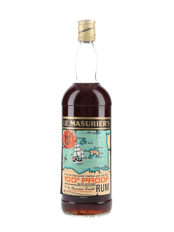 A litre bottle of Extra Quality 100 Proof Rum, bottled by Le Masurier's of Jersey. We estimate this was bottled in the 1970s.