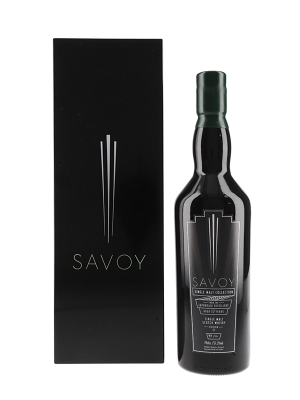 A bottle of Laphroaig 17 Year Old Single Malt Scotch Whisky, bottled by Speciality Drinks as part of the Savoy Collection. This bottling revives a decades-old tradition of spirits being bottled exclusively for the Savoy's world-famous bar. Every bottle is hand-numbered and presented in a lacquered box.