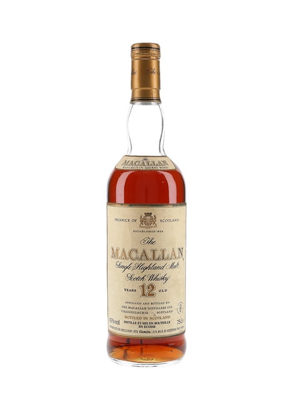 A bottle of The Macallan 12 Year Old Single Highland Malt Scotch Whisky. This was bottled for the French market and imported by Gouin, we estimate in the early 1990s.