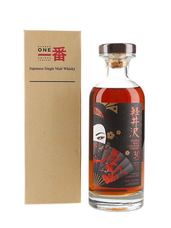 A bottle of Karuizawa 30 year old Single Malt Japanese Whisky, one of a pair of Aika Geishas released in 2014. This sherry cask-matured malt was distilled in the 1980s and bottled by Number One Drinks exclusively for Speciality Drinks. Each bottle in the pair has complementary labels designed by The Whisky Exchange's creative director Raj Chavda.