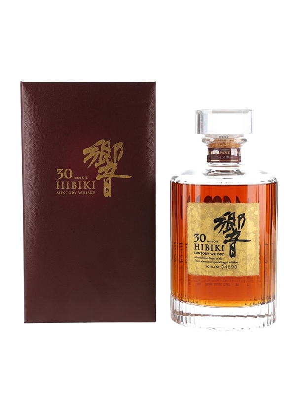 A bottle of Hibiki 30 Year Old Suntory Whisky produced in Japan. This is a critically acclaimed blend from Suntory and is presented in a Kagami crystal decanter. It is presented in a 30-faceted crystal decanter celebrating the beauty and elegance that is Hibiki.