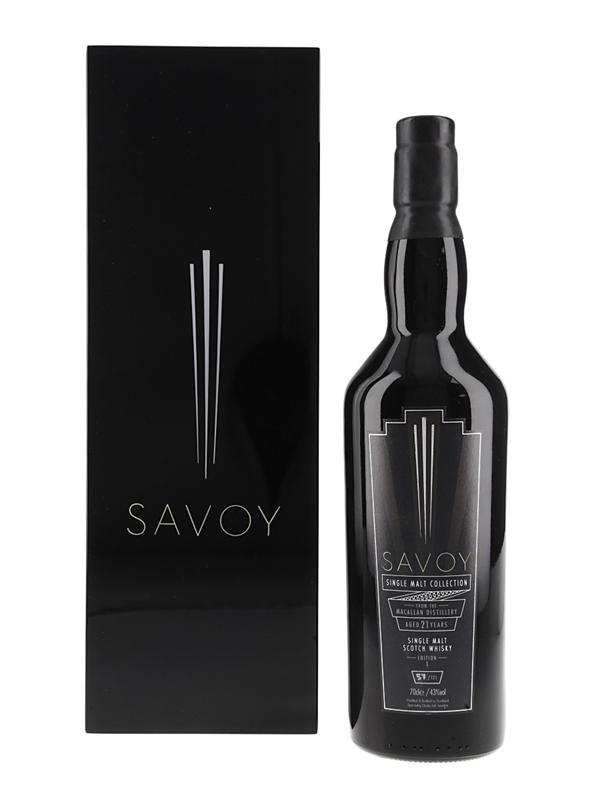 A bottle of The Macallan 21 Year Old Single Malt Scotch Whisky, bottled by Speciality Drinks as part of the Savoy Collection. This bottling revives a decades-old tradition of spirits being bottled exclusively for the Savoy's world-famous bar. Every bottle is hand-numbered and presented in a lacquer box.