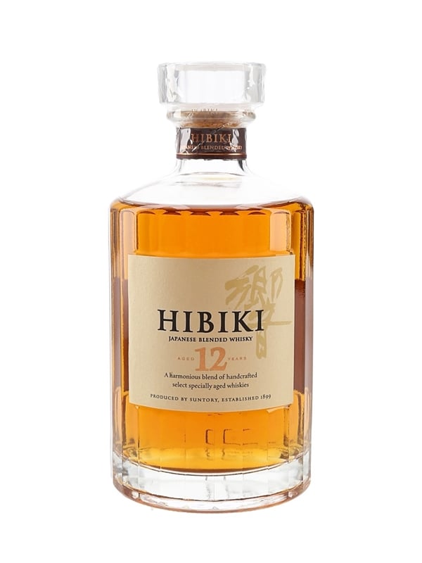 A bottle of Hibiki 12 Year Old Suntory Whisky, a blend of specially aged whiskies. This was imported to the UK by Morrison Bowmore Distillers Limited.